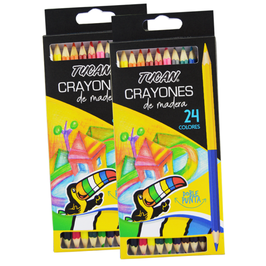 Crayón de madera con forma hexagonal. Incluye 12 crayones en 24 colores diferentes, ya que cuenta con 2 colores por crayón, un color en cada extremo.