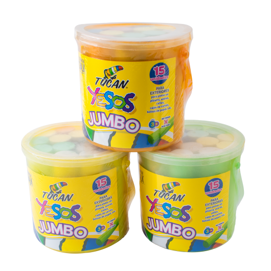 Yeso Jumbo que incluye 6 diferentes colores, ademas encontrarás tus yesos resguardados en una cubeta para mantenerlos seguros. Las medidas de tus yesos Jumbo Tucán son 9.5 X 2.25 cm