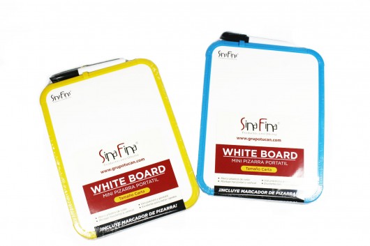 Pequeña pizarra de tamaño carta que incluye un marcador. Ideal para poder llevar a cualquier lugar por su poco peso y fácil manejo. 2 colores diferentes: amarillo y azul.